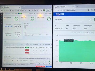 Model Antminer S21 Hyd (335Th) from Bitmain mining SHA-256 algorithm with a maximum hashrate of 335Th/s for a power consumption of 5360W.