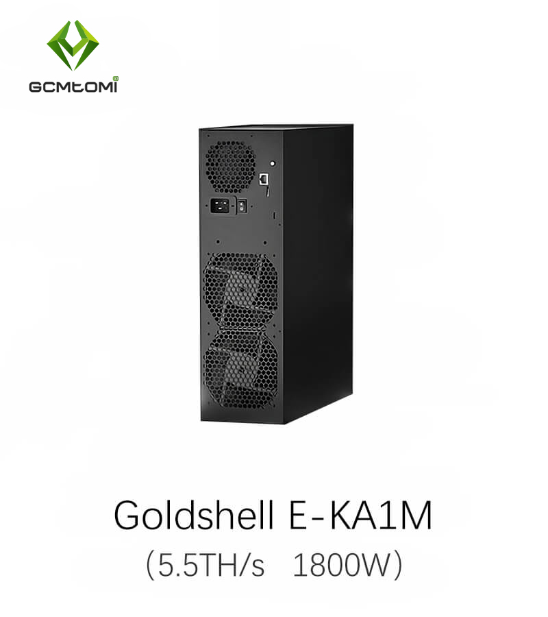 The Goldshell E-KA1M model mines the KHeavyHash algorithm with a maximum hashrate of 5.5 Th/s, consuming 1800W of power.