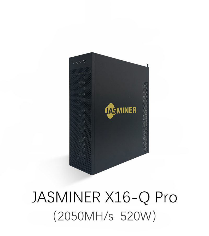 Model X16-Q Pro from Jasminer mining EtHash algorithm with a maximum hashrate of 2.05Gh/s for a power consumption of 520W.