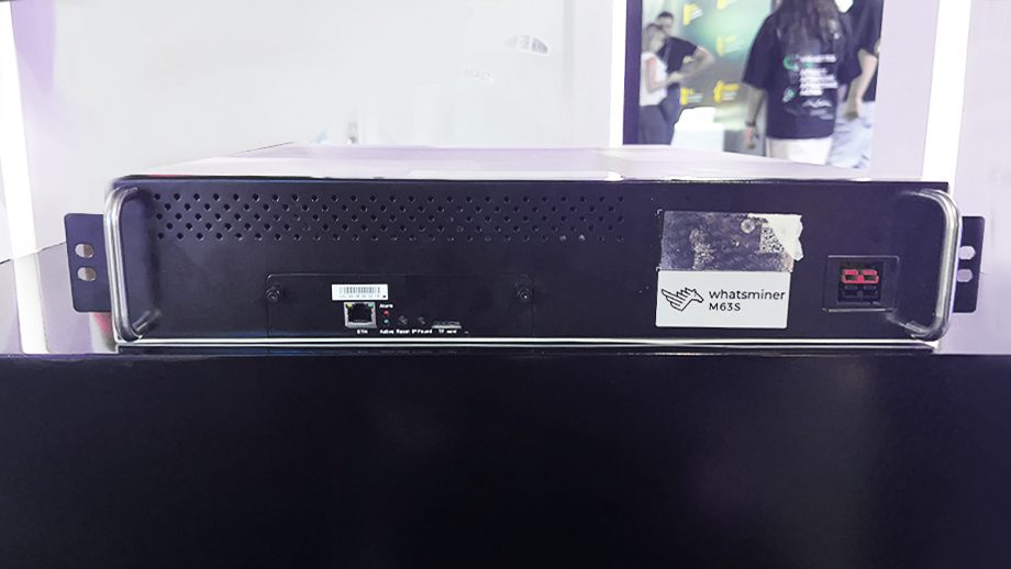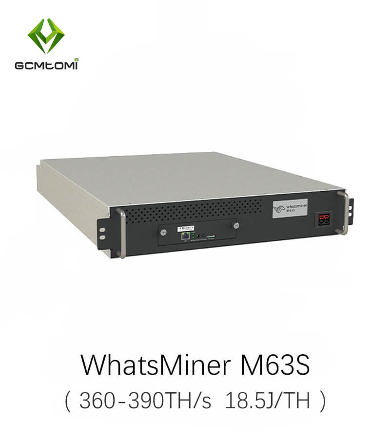Model Whatsminer M63S from MicroBT mining SHA-256 algorithm with a maximum hashrate of 390Th/s for a power consumption of 7215W.